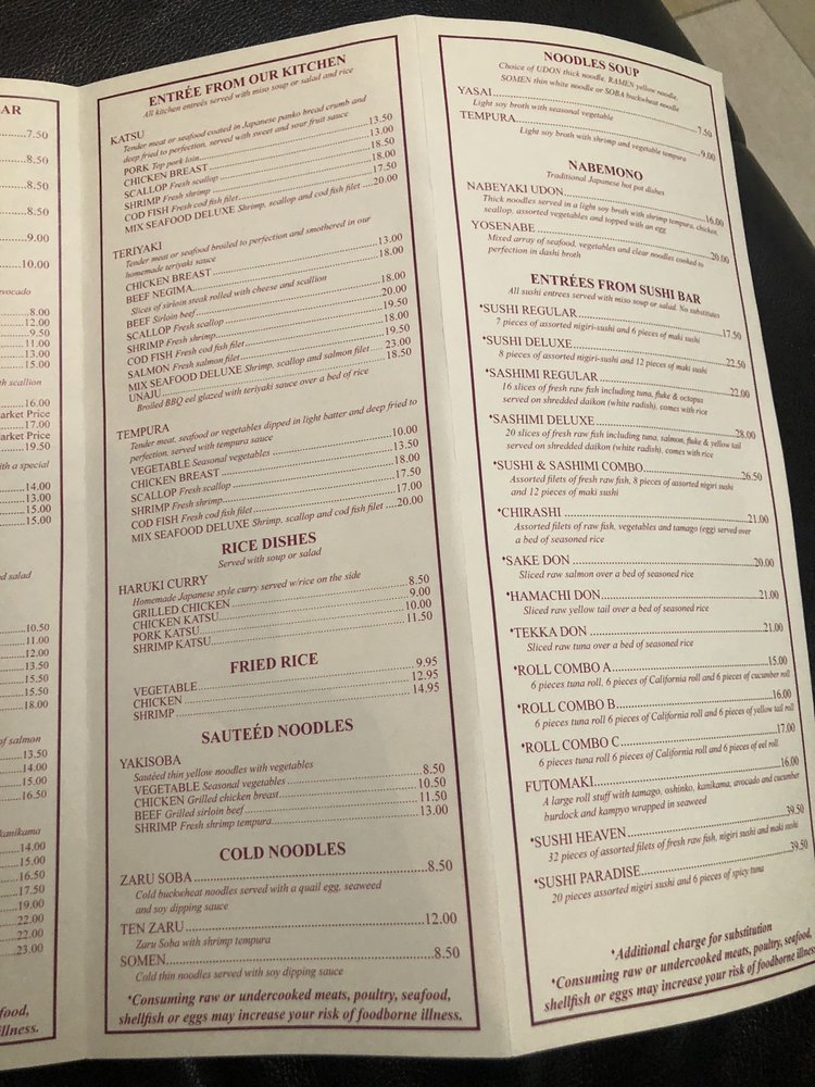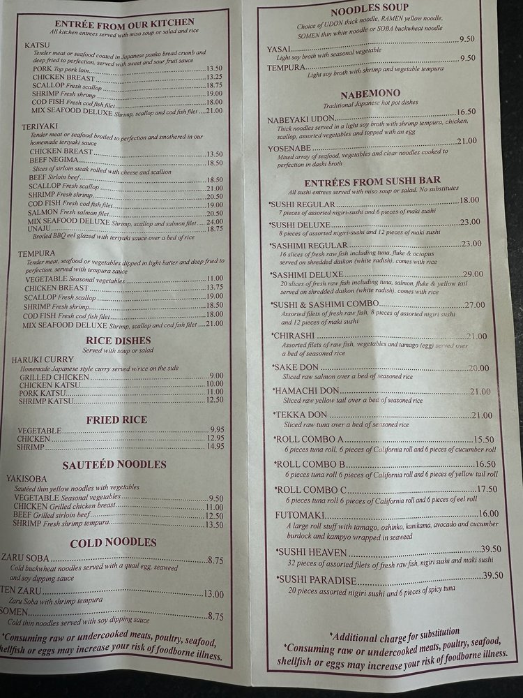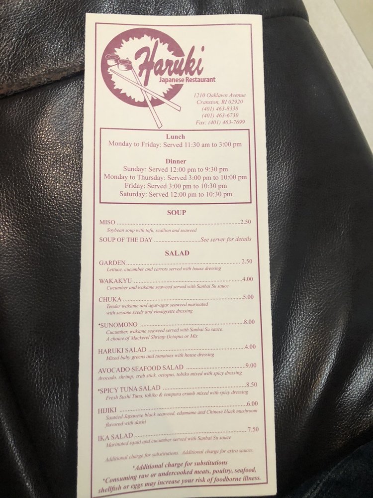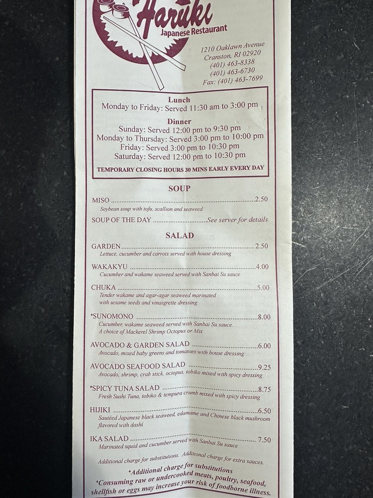 Haruki is a sushi bar in Cranston, RI, offering a variety of Japanese dishes. With a casual atmosphere and top-notch service, Haruki is a go-to spot for fresh and delicious food. The menu boasts appetizers like Edamame and Vegetable Tempura, along with unique sushi bar options like Ikura Mizore and Maguro Nuta. The miso soup and special dishes like Tuna Yamakake are must-tries. Customers rave about the quality of the food and the speedy service, making it a popular choice for both dine-in and takeout. Whether you're a sushi connoisseur or just looking for a great meal, Haruki exceeds expectations with its flavorful dishes and welcoming ambiance. Make sure to try their Chicken Tempura or tasty veggie rolls with their homemade dressing for a delightful dining experience at Haruki.